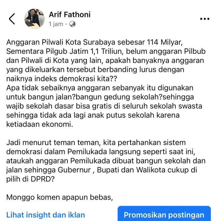 Dalam pernyataannya melalui akun media sosial facebook yang diunggah pada Sabtu (14/12/2024), Arif Fathoni menyoroti anggaran Pilwali Surabaya yang mencapai Rp114 miliar, sementara anggaran Pilgub Jawa Timur mencapai Rp1,1 triliun.